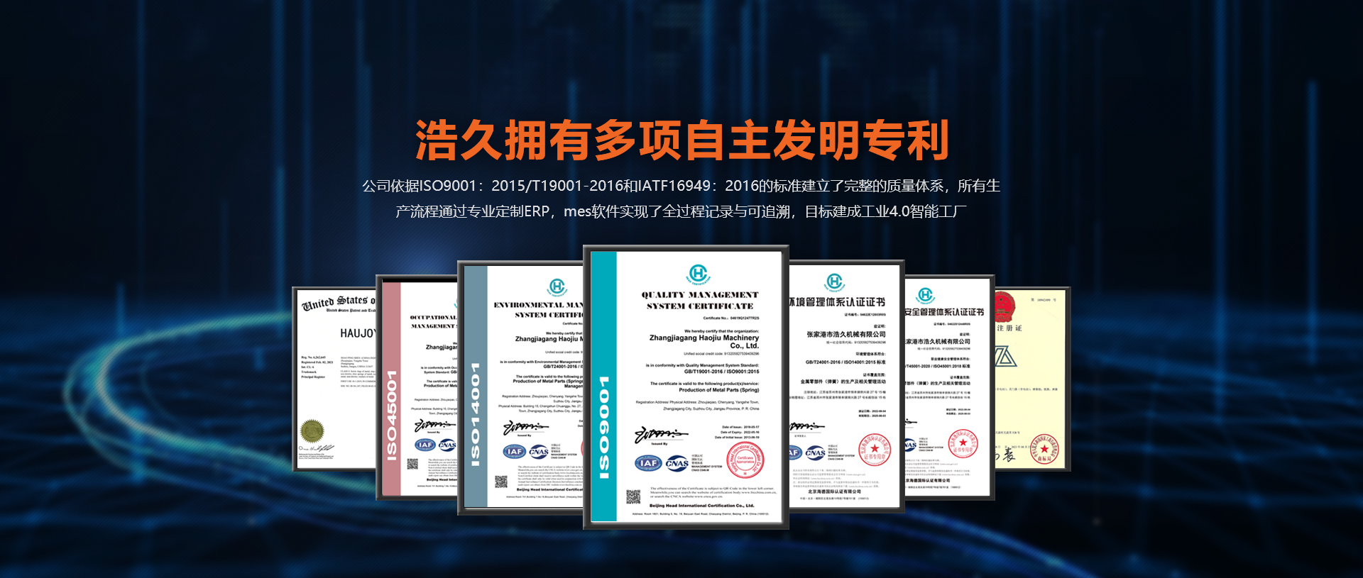 擁有GB/T24001-2016 / ISO14001:2015 標準的環境認證證書,GB/T45001-2020 / ISO45001:2018 標準的職業健康安全管理體系認證證書等多項實力認證證書